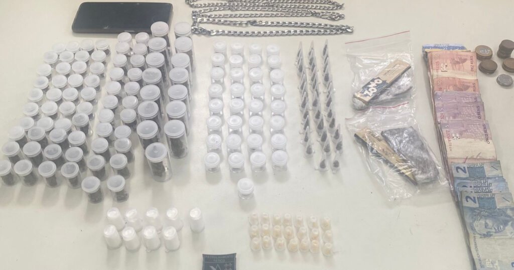 Nas sacolas haviam uma boa quantidade de drogas, dinheiro em espécie e um aparelho celular.