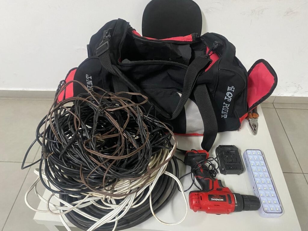 Ao revistar a bolsa, a equipe localizou fios de cobre e também ferramentas; parafusadeira, alicate e uma luz emergencial.
