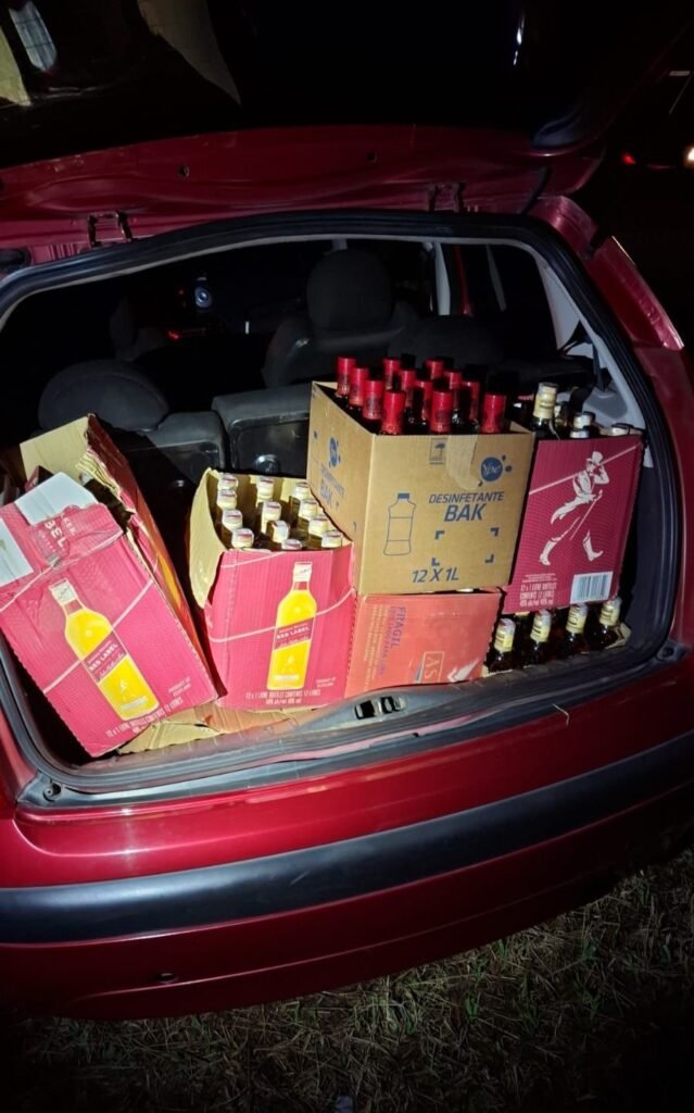 Na busca veicular, foram localizadas cerca de 116 garrafas de Red Label e 34 de Smirnoff, sem notas fiscais e com evidentes indícios de falsificação.