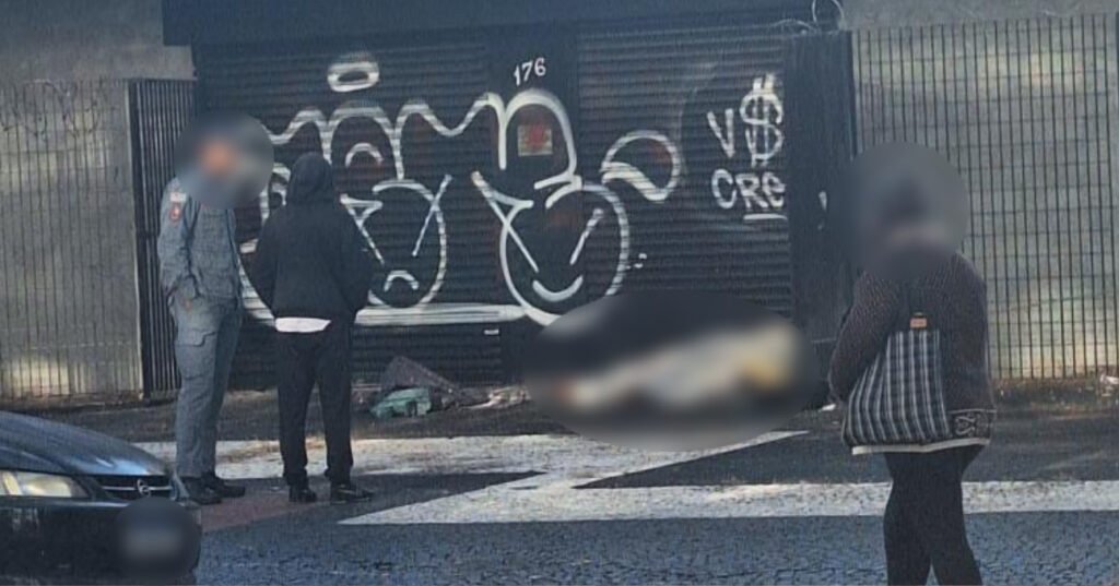 Um homem, ainda sem identificação, foi localizado sem vida. A vítima estava deitada na calçada e coberta com alguns cobertores.