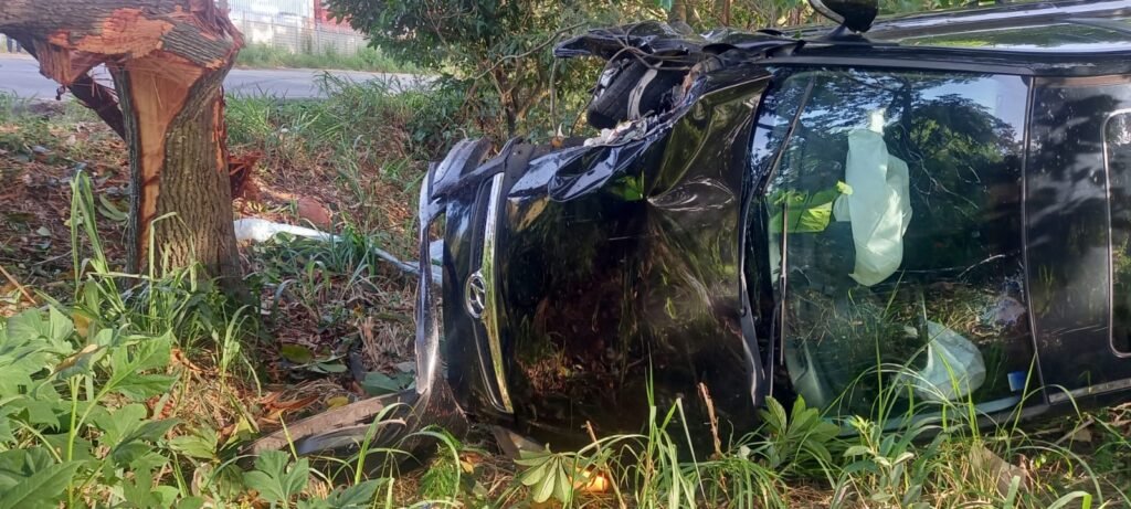 Na manhã deste domingo (18), um veículo Hyundai I30 perdeu o controle da direção, bateu contra uma árvore e capotou na Marginal do Rio Jundiaí.