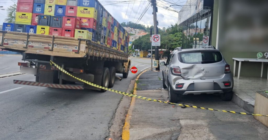 O caminhão atingiu o veículo, que foi projetado contra a calçada, atropelando a idosa.
