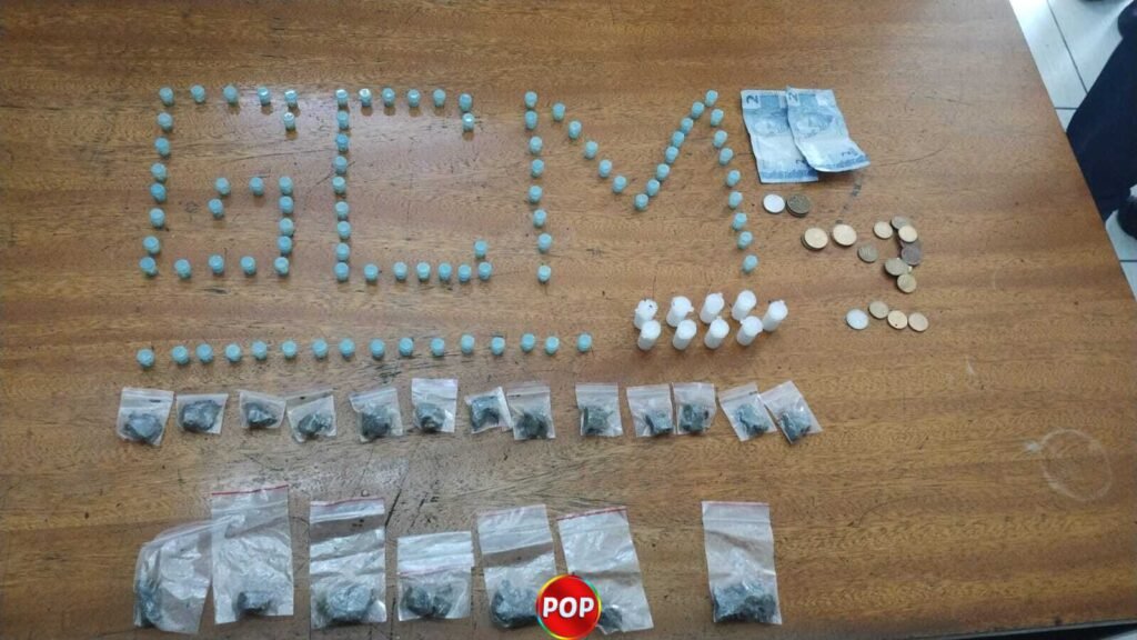 Os GCM’S localizaram na pochete centenas de porções de entorpecentes (crack, cocaína e maconha), além de dinheiro em espécie.