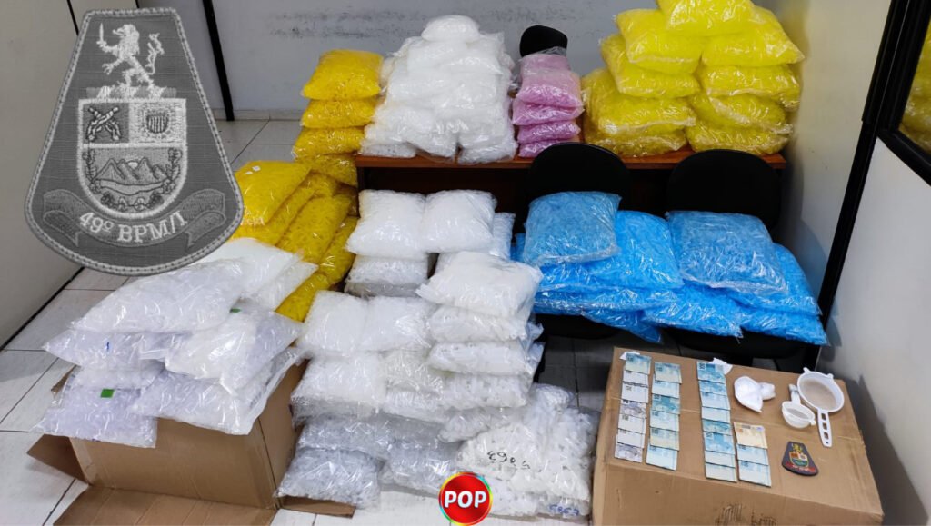 No total foram apreendidos R$23.349,00 (vinte três mil trezentos e quarenta e nove reais), 109 mil tubetes para cocaína, 500 embalagens “conta gota” e 500 embalagens para maconha.