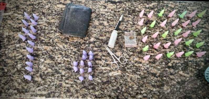 Realizada a abordagem e busca pessoal foi localizado 32 (trinta e dois) eppendorfs de cocaína, 26 (vinte e seis) eppendorfs de crack, 01 (um) cigarro de maconha e 02 (dois) eppendorfs com uma substância aparentando ser K2.