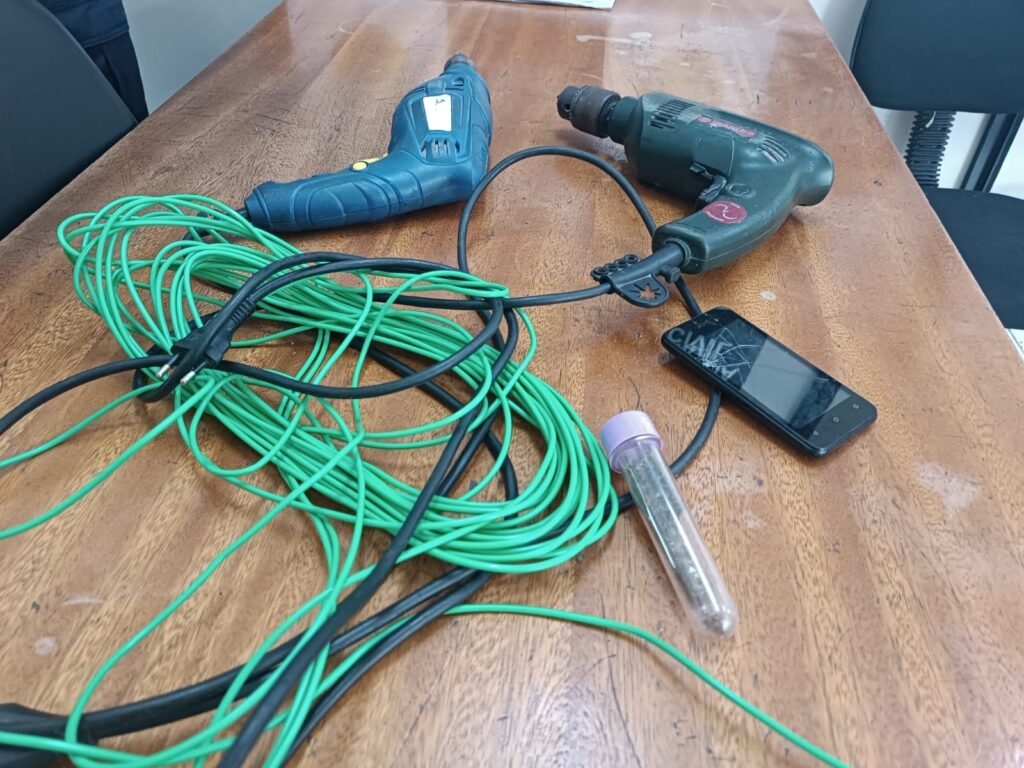 Os guardas avistaram dois indivíduos em atitude suspeita. Um pouco mais à frente, um senhor acenou para as equipes e informou que dois indivíduos haviam furtado suas ferramentas de trabalho (duas furadeiras e alguns metros de fio de cobre).