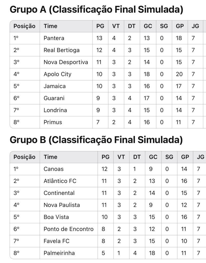 O ChatGPT colocou as equipes do Pantera, Real Bertioga, Nova Desportiva e Apólo City como os quatro classificados para a próxima fase do grupo A. Já no grupo B, Canoas, Atlântico, Continental e Nova Paulista.