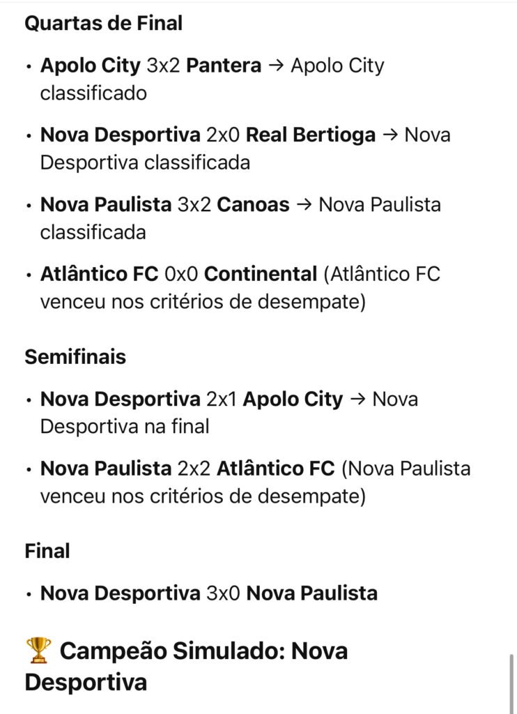 A inteligência artificial deu o título para a equipe do Nova Desportiva, após uma vitória de 3 a 0 contra o Nova Paulista.