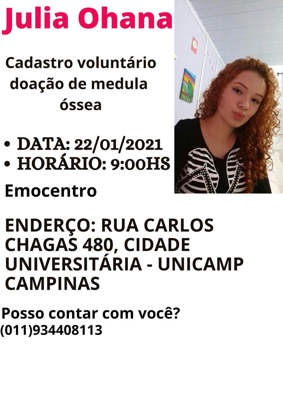 A Jovem Júlia Ohana de 16 anos, moradora do bairro Caxambu em Jundiaí precisa de doadores de medula óssea.