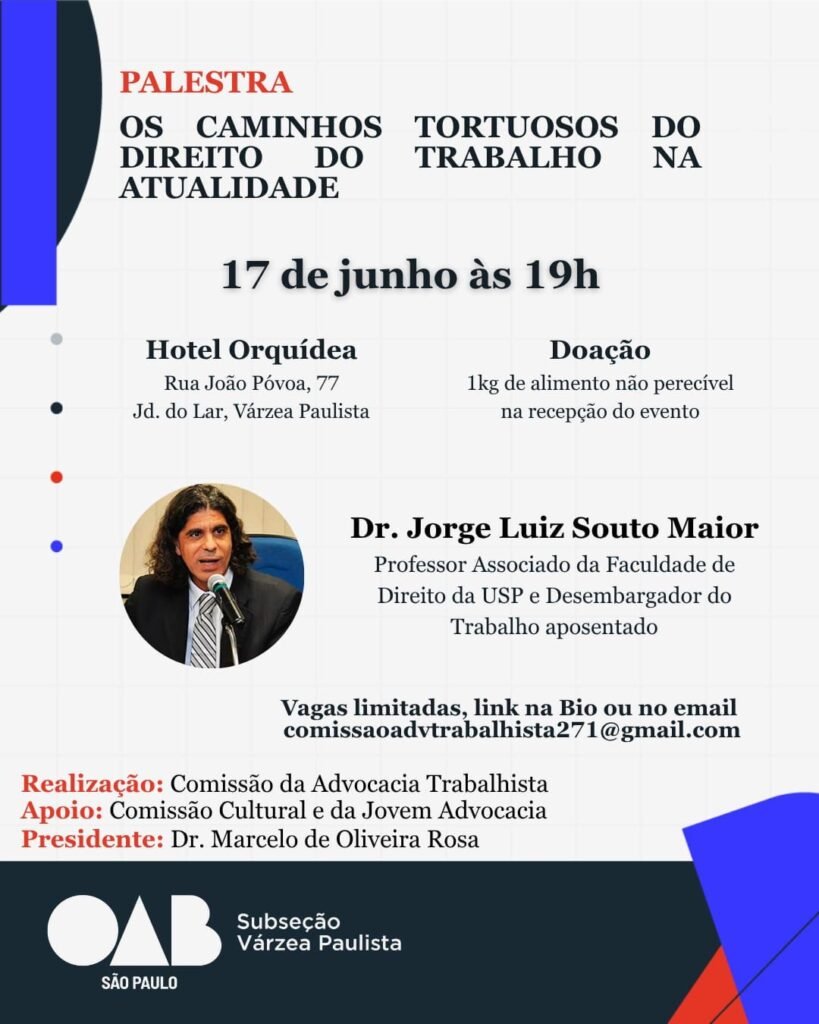 A OAB de Várzea Paulista, por meio do presidente Dr. Marcelo Rosa, em conjunto com as comissões da Advocacia Trabalhista e da Jovem Advocacia, convida toda advocacia, e estudantes de Direito para a palestra com o renomado jurista Dr. Jorge Luiz Souto Maior.