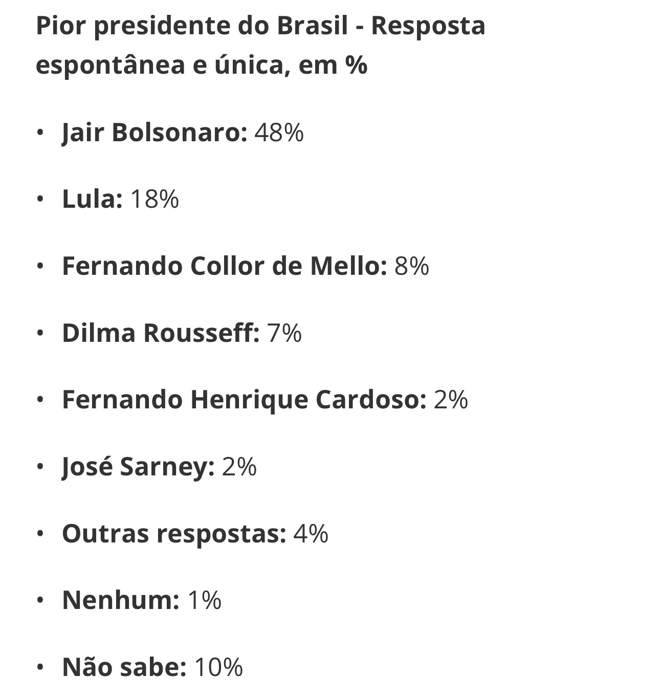 O Datafolha perguntou também quem foi o pior presidente da história do Brasil. Bolsonaro foi citado por 48% dos entrevistados. Lula foi citado por 18% dos entrevistados. Não é possível comparações, pois foi a primeira que a pergunta foi feita.