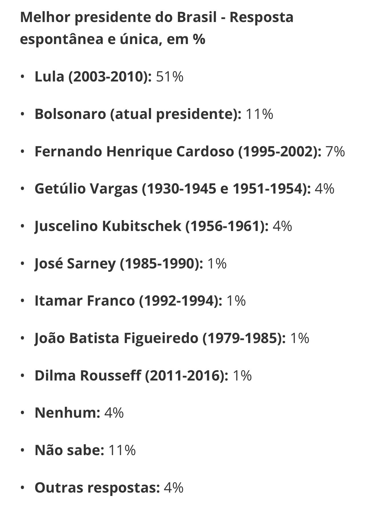 Segundo o instituto, Lula lidera o ranking dos ex-presidentes, com 51% de preferência. O petista governou o país entre 2003 e 2010. Bolsonaro é o preferido de 11%. Ambos vão disputar a corrida eleitoral em 2022. Fernando Henrique Cardoso aparece em 3º, com preferência de 7% dos entrevistados. Veja os resultados: