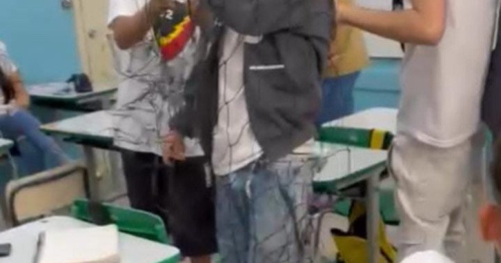Seus colegas de sala, retiraram a rede da quadra da escola, sem nenhum funcionário perceber, levaram até na sala de aula e colocaram em seu filho.