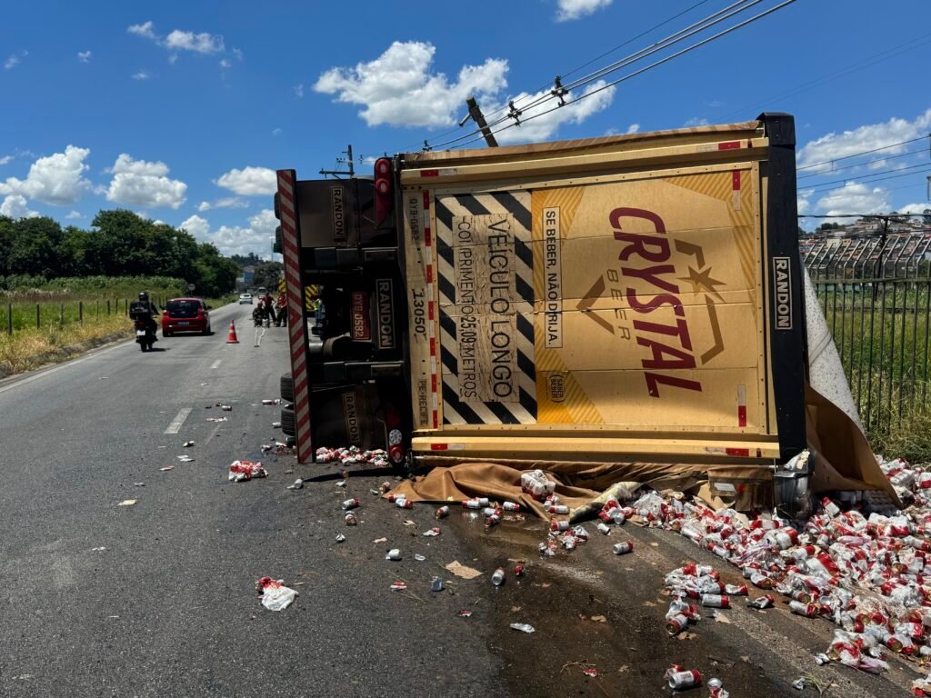 A carga que, a princípio, disseram que era de cerveja cristal, na verdade, era de Itaipava; parte dela ficou esparramada na via.