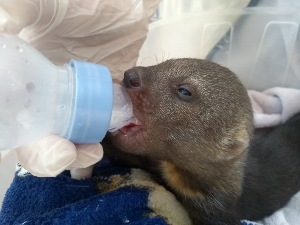 “Estamos fazendo amamentação a cada três horas, durante o dia todo, e ele está respondendo super bem. Está urinando e defecando normalmente, e vem se desenvolvendo sem apresentar problemas. Os cuidados são de 24 horas, sempre procurando mantê-lo confortável e aquecido. E outro bom sinal é que ele já está vocalizando. Agora é continuar com as observações, fazendo os exames de biometria e pesagem todos os dias para ajustar sua alimentação”, explica Rita Tarallo, bióloga responsável pela Maternidade da Mata Ciliar.