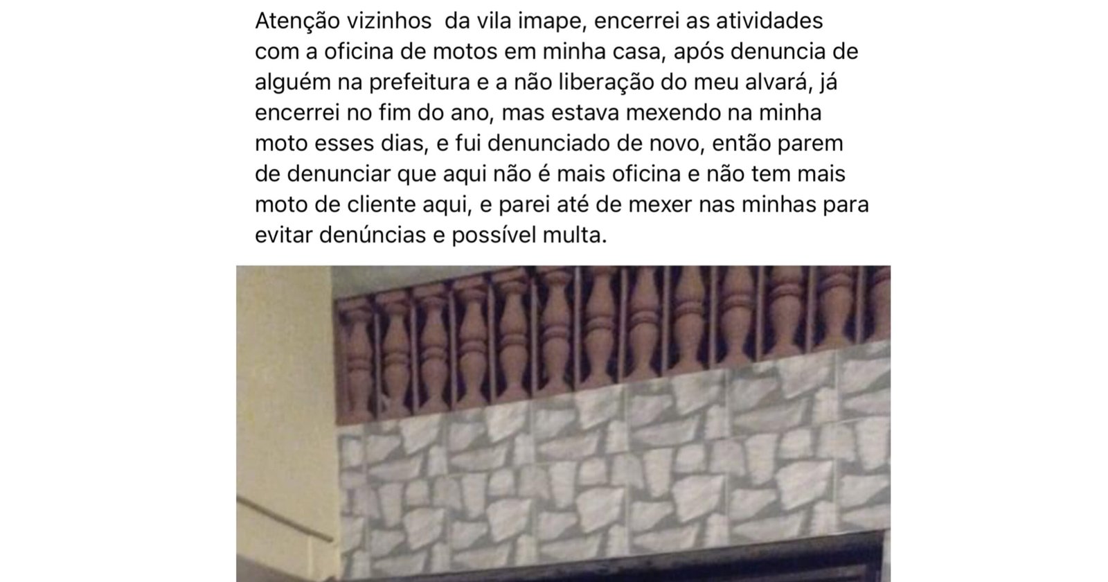 “Atenção vizinhos da Vila Imape. Eu já encerrei as atividades com a oficina de motos em minha casa, após denuncia de alguém na prefeitura e a não liberação do meu alvará, já encerrei no fim do ano. Mas estava mexendo na minha moto esses dias, e fui denunciado de novo, então parem de denunciar que aqui não é mais oficina e não tem mais moto de cliente aqui, e parei até de mexer nas minhas para evitar denúncias e possível multa.” Divulgou o mecânico