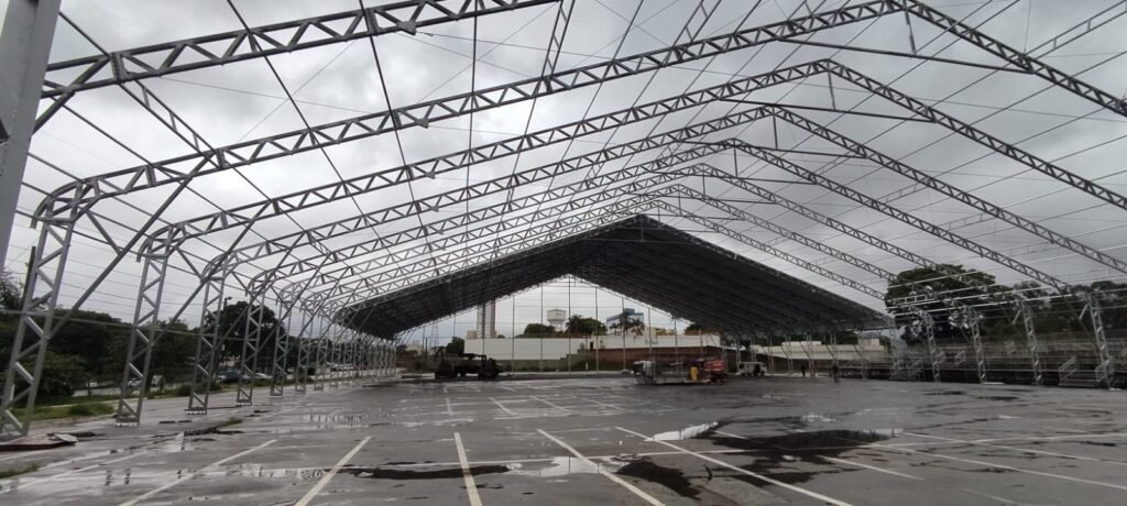 A estrutura que vai cobrir toda a arena do festival Fextoucontinua sendo montada. As pessoas podem até pensar que a montagem está atrasada. Mas como resta menos de uma semana para o início da festa o tempo é suficiente para deixar tudo pronto. O motivo para o desacordo com o planejamento do evento deve ser creditado a chuva. Wandy Nogueira, um dos produtores do evento, fala que está em contato com a empresa contratada para fazer a arena e estão monitorando o andamento do trabalho e a previsão da chuva: “É preciso fazer gestão e ter organização para aproveitar as brechas que São Pedro oferece. Todos devem ficar tranquilos que o relógio está anosso favor. Lembrando que a cobertura é fundamental para dar conforto térmico e proteção contra a chuva a todos.”