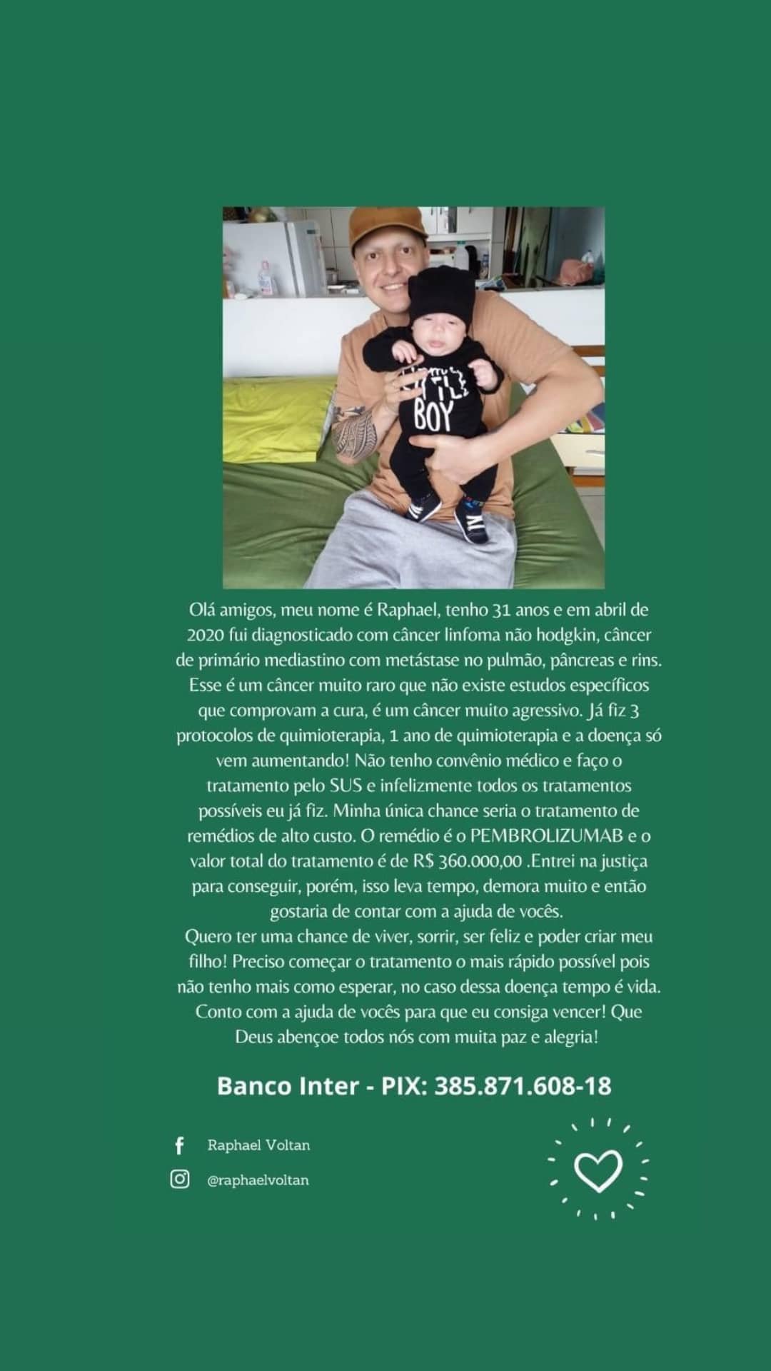 RegiãoSaúde Morador de Campo Limpo pede ajuda no tratamento contra o câncer por O estagiário em 23/06/2021 Pessoal esse é nosso amigo Raphael, morador de Campo Limpo Paulista. Ele acabou de ser pai e está pedindo ajuda para pagar seu tratamento contra o câncer. Caso você possa ajudar de qualquer forma, esse é pix do nosso amigo e suas redes sociais.
