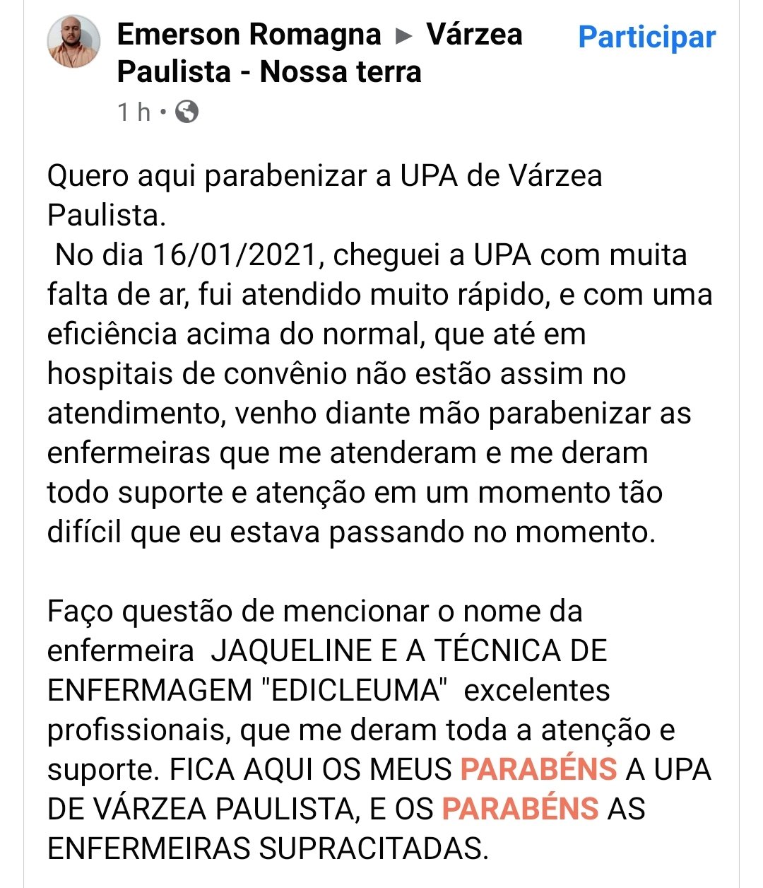 Saúde Morador de Várzea Paulista parabeniza equipe da UPA por O estagiário atualizado 25/01/2021 Um morador de Várzea Paulista utilizou as redes sociais para parabenizar o atendimento na UPA (Unidade de Pronto Atendimento) da cidade. UPA Várzea PaulistaVárzea Paulista