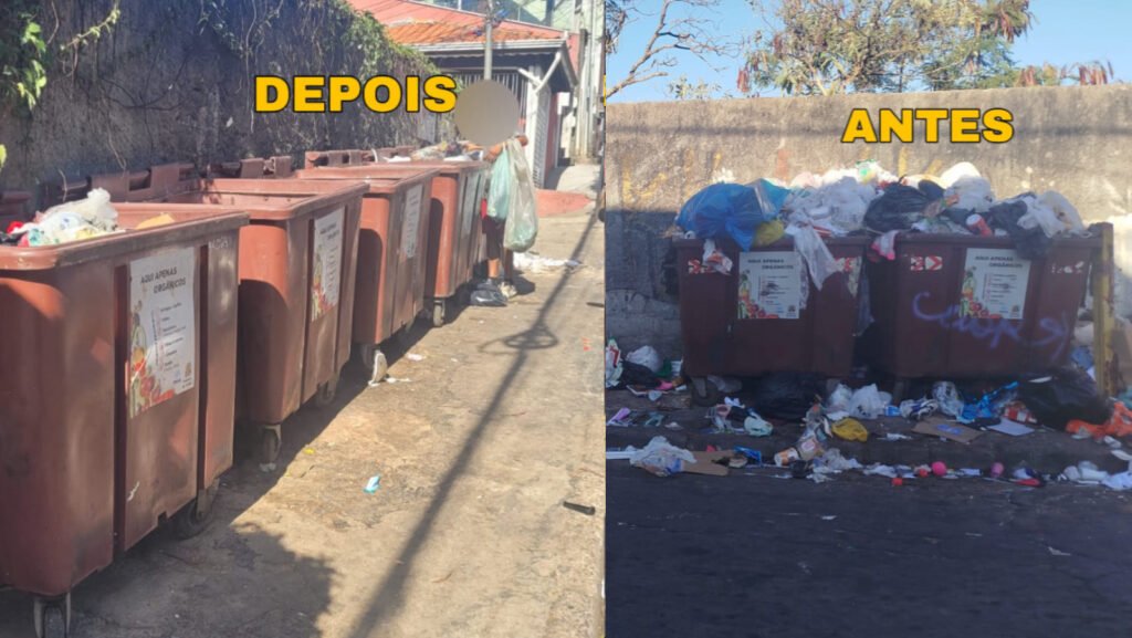 Segundo o relato, os containers ficam frequentemente lotados, o que leva moradores a depositarem lixo nas calçadas. A situação ainda é agravada pela ação de pessoas em situação de rua e animais, que rasgam os sacos e espalham a sujeira pelas ruas.