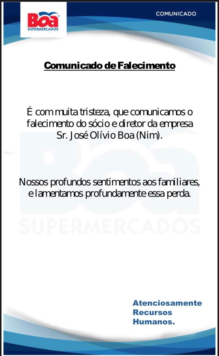RegiãoVárzea Paulista Morre Sócio e Diretor do Supermercado Boa por O estagiário em 04/06/2021 Morre Sócio e Diretor do Supermercado Boa. Segundo informações, José Olívio Boa, mais conhecido como Nim passou mal durante a tarde desta sexta-feira (04) vindo a falecer, o Boa Supermercados emitiu um comunicado. Em breve mais Informações