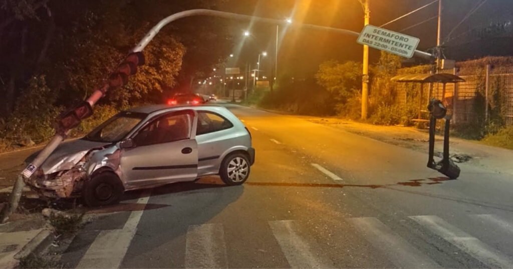 Na madrugada deste domingo (21), um veículo com placas de Várzea Paulista, bateu contra um poste de sinalização na Marginal do Rio Jundiaí.