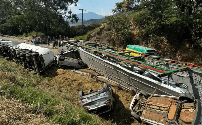 Segundo testemunhas, o caminhão cegonha havia perdido controle na estrada após bater em outro carro, segundos antes de empurrar o caminhão de caminhão tanque para o acostamento.