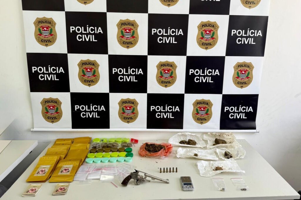 A equipe se deslocou até o imóvel do indivíduo, onde foram encontrados um revólver calibre .32, mais entorpecentes (quase 1 kg), material para embalo e uma balança de precisão.