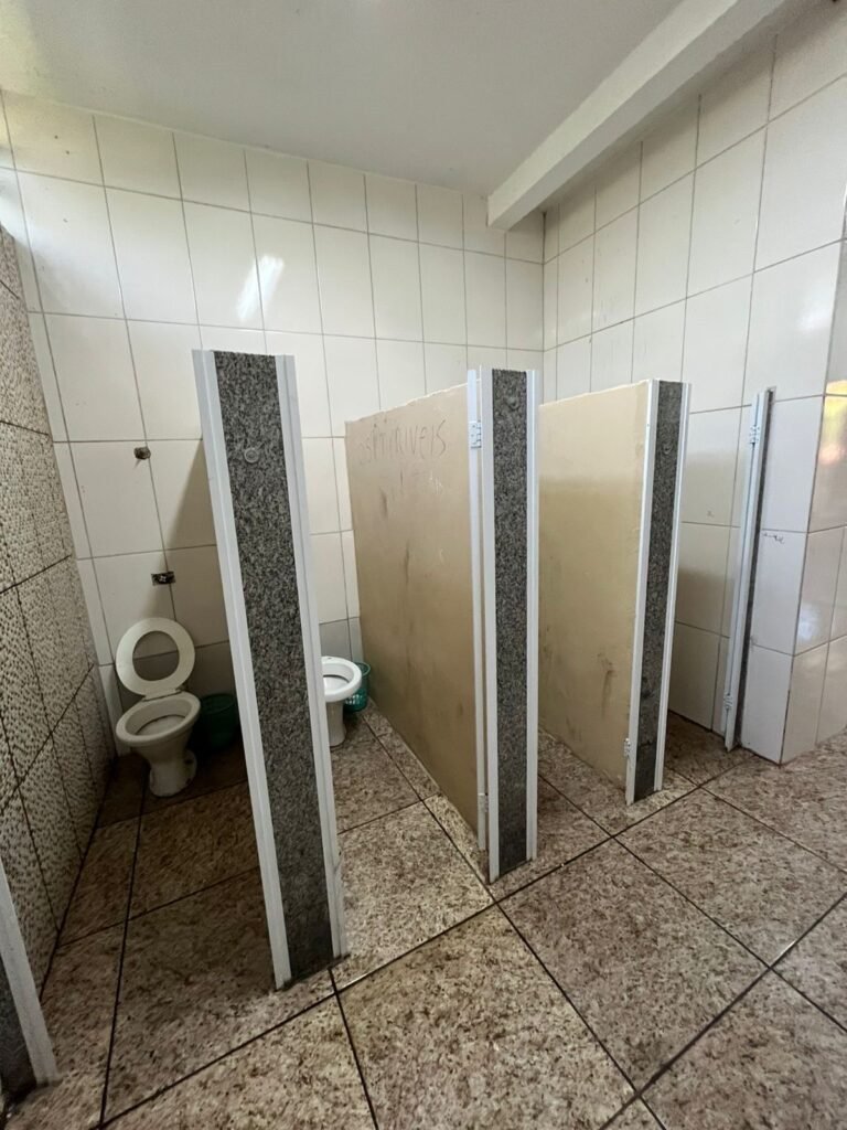 Segundo a denúncia dos alunos, o banheiro masculino está sem portas, impossibilitando os alunos de fazerem suas necessidades. Além disso, o banheiro se encontra sem torneiras para lavar as mãos.