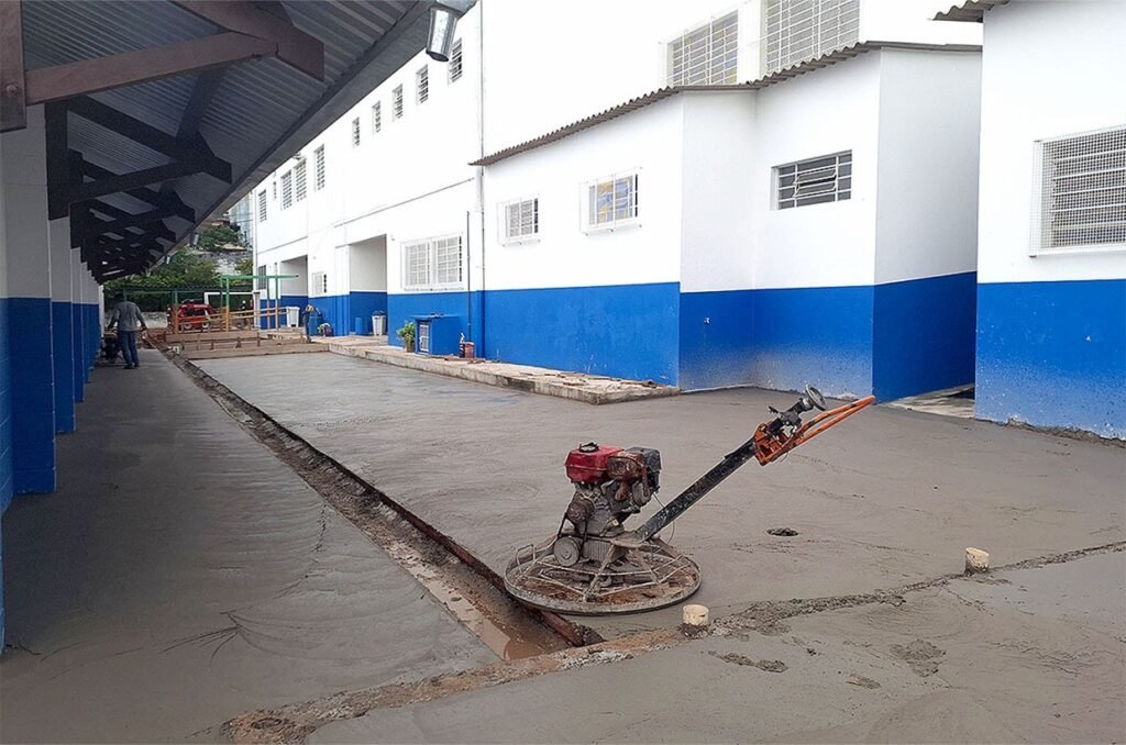 As obras na CEMEB Palmyra Aurora de Almeida Rinaldi, localizada no Parque Guarani, estão em ritmo acelerado antes do início do ano letivo. Nesta segunda-feira (27), o pátio da escola recebeu 500 metros quadrados de concreto, que já passam pelo processo de polimento para finalização.