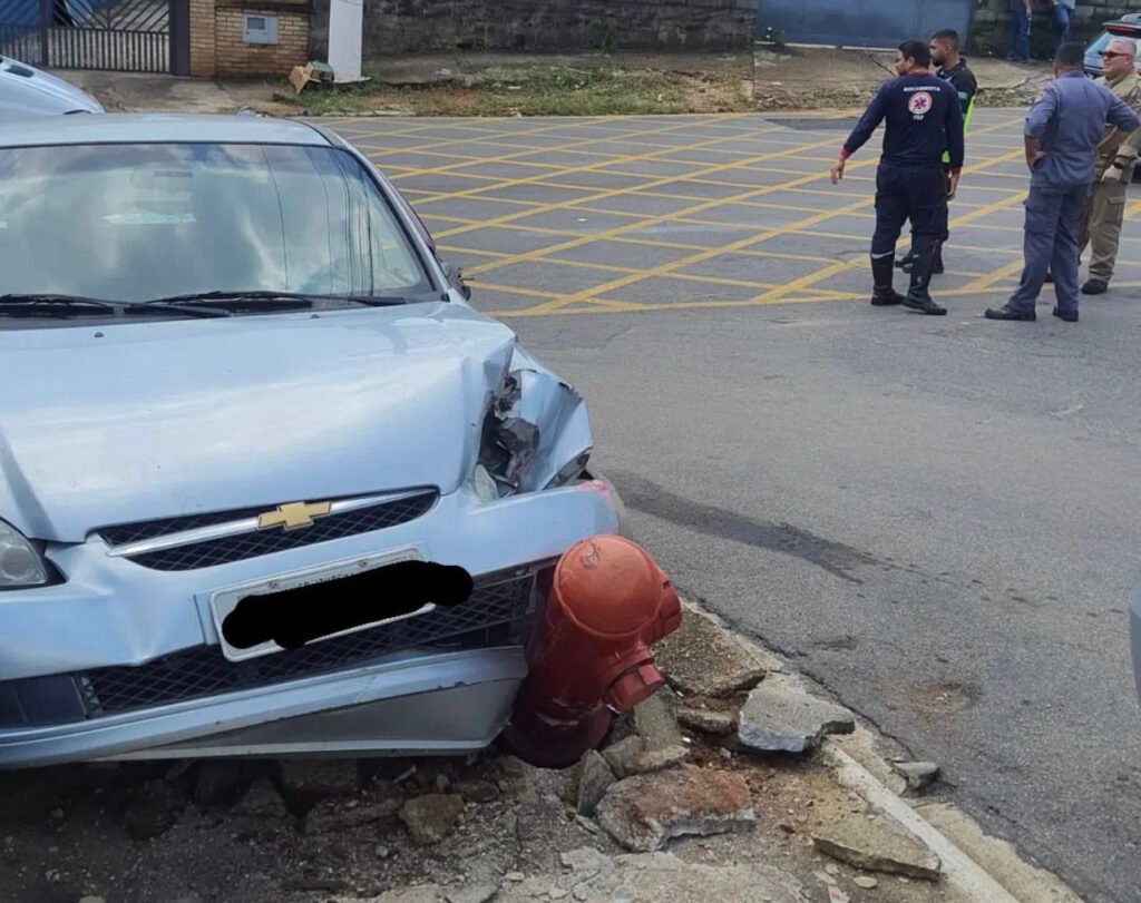 Para não bater de frente com outros veículos, motorista sobe na calçada e atinge hidrante.