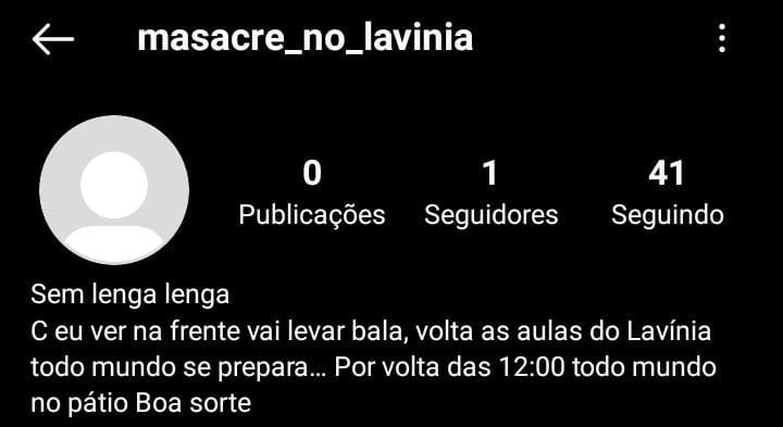 O responsável pela conta denominada @masacre_do_lavinia promete matar alunos e professores.