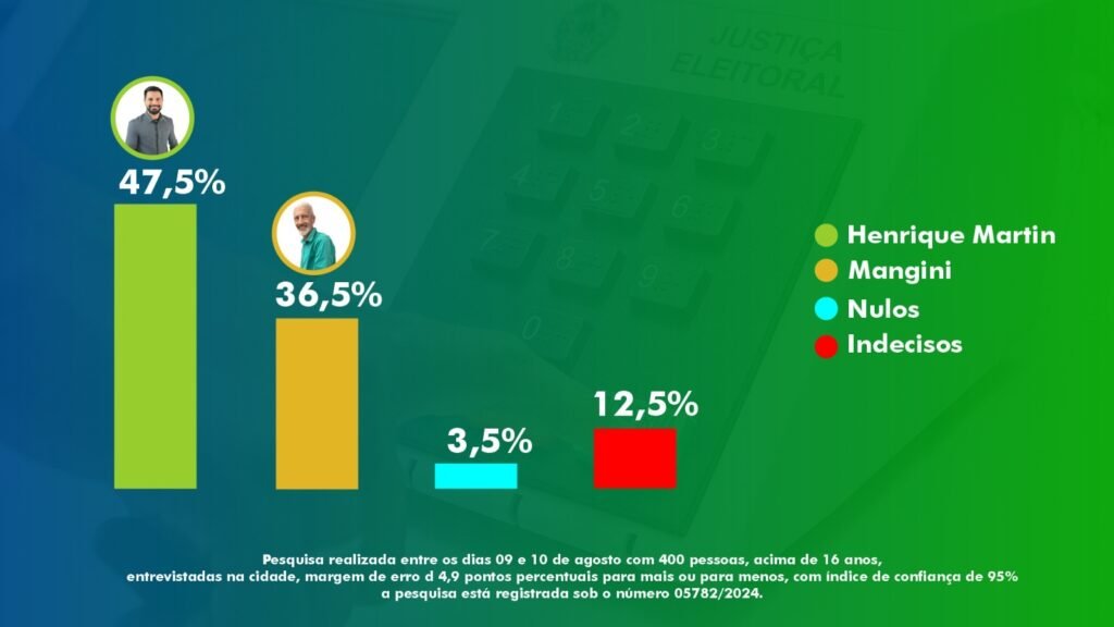 Na sondagem estimulada o ex-prefeito Henrique Martin também aparece como o candidato favorito na disputa pela prefeitura, com 47,5% das intenções de voto. Antonio Carlos Mangini, por sua vez, aparece com 36,5% das intenções de voto. A pesquisa também indica que 3,5% dos eleitores pretendem votar em branco ou anular o voto, enquanto 12,5% ainda não decidiram em quem irão votar.
