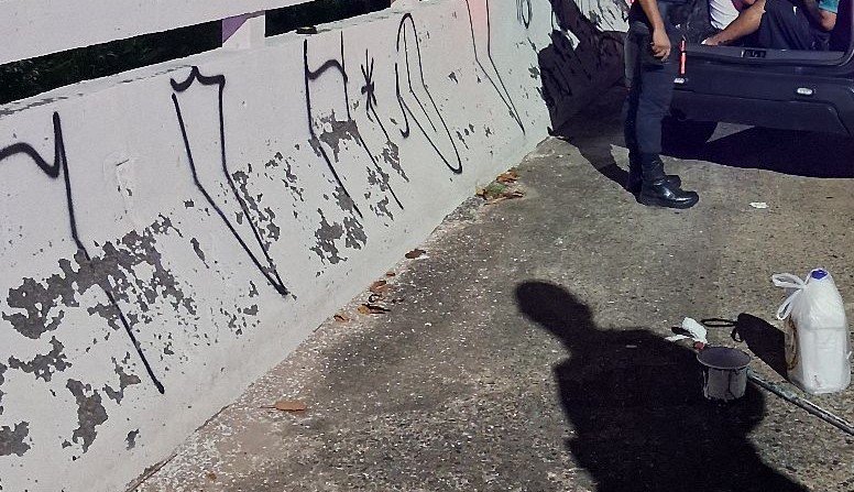 De imediato foram visualizados quatro indivíduos realizando a pichação com rolo e lata de tinta.