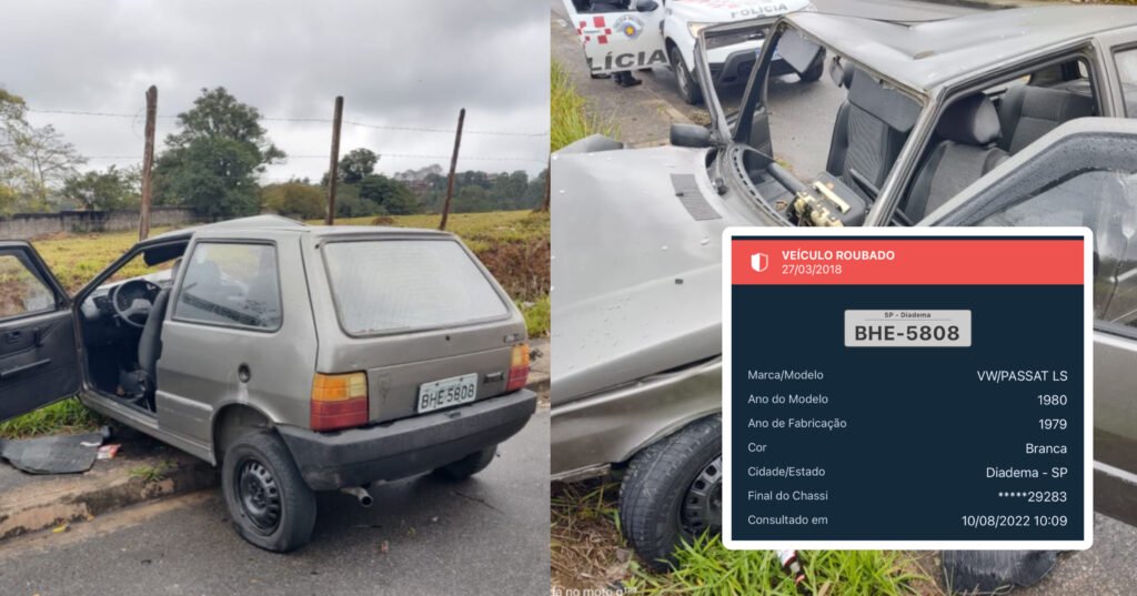 Após feita uma consulta na placa do veículo, pelo App Sinesp Cidadão, foi informado que a placa do veículo é de outro automóvel produto de roubo.