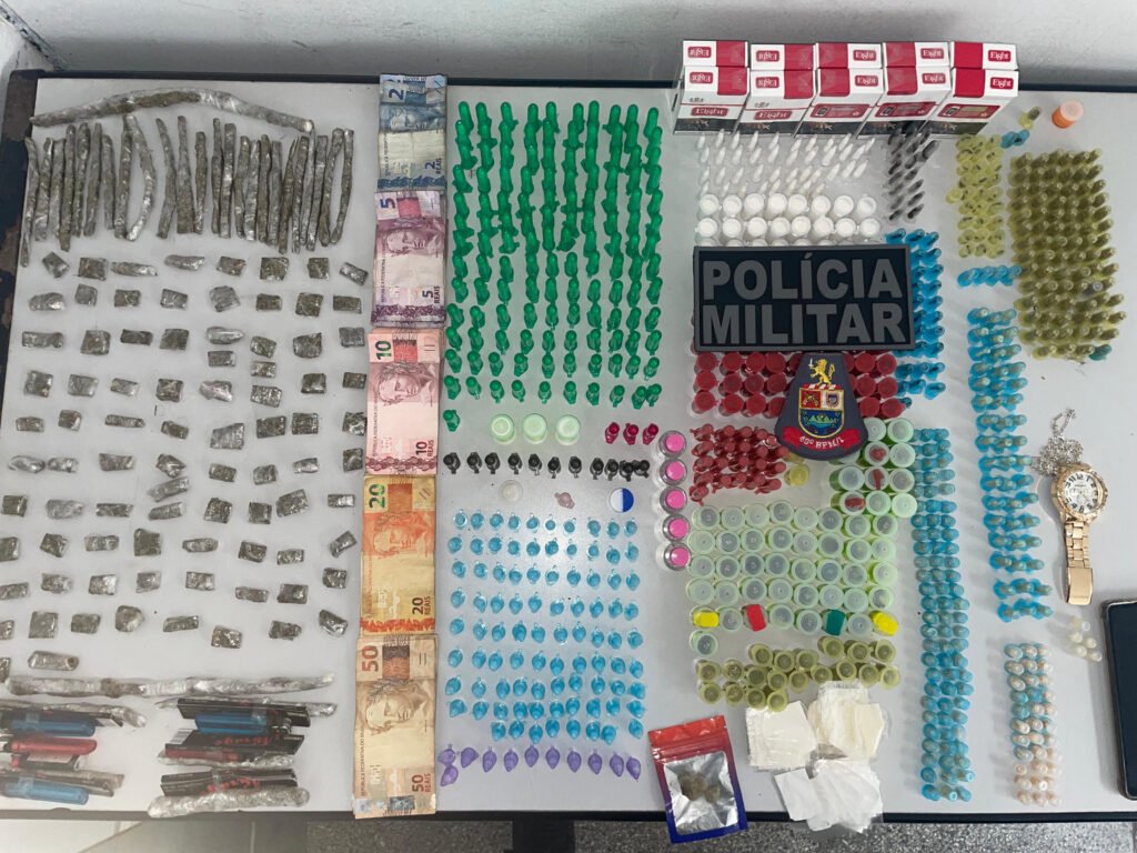 No interior, a jovem que o acompanhava apresentava semblante assustado e permaneceu em silêncio. Com a permissão para averiguar o ambiente, os policiais localizaram inicialmente porções de cocaína e crack em um móvel próximo à porta. Em seguida, encontraram, dentro de uma mochila, grande quantidade de entorpecentes variados, incluindo maconha, cocaína, crack, ecstasy, LSD, haxixe e frascos de lança-perfume.