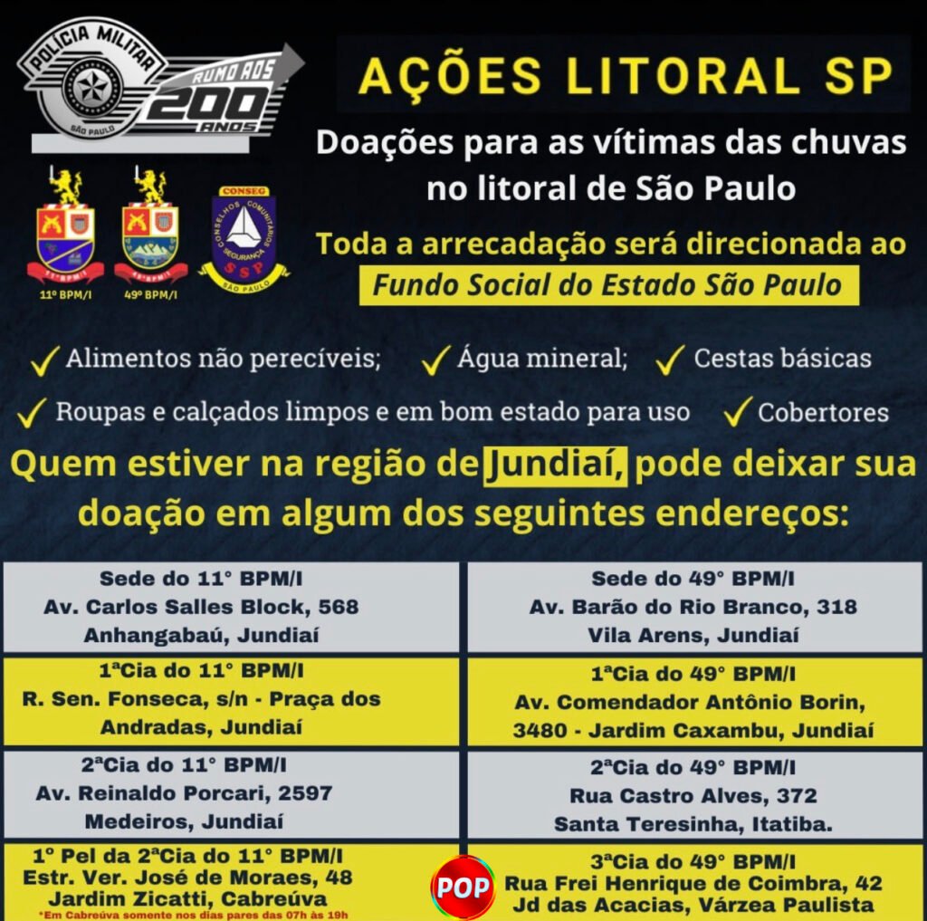 Policiais Militares do 11ºBMP/I e do 49ºBPM/I (Policiais que fazem o patrulhamento das cidades da região metropolitana de Jundiaí), estão arrecadando doações para as vítimas das chuvas no litoral de São Paulo.