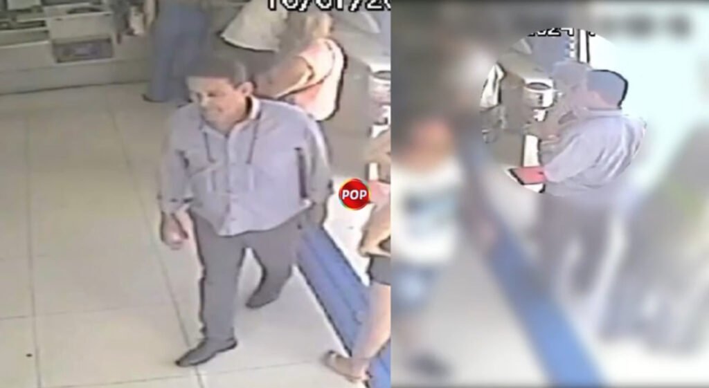 Uma câmera de segurança flagrou um dos criminosos, de camisa azul e óculos no pescoço, acompanhado a idosa até a lotérica da Vila Arens.