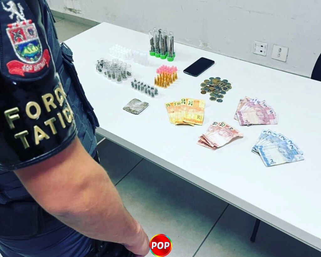 Na abordagem, foram localizadas duas sacolas com 42 porções de maconha, 18 pinos de cocaína, 22 porções de crack, 22 embalagens com “k2” e 04 frascos com lança perfume e ainda R$217,00 em dinheiro.