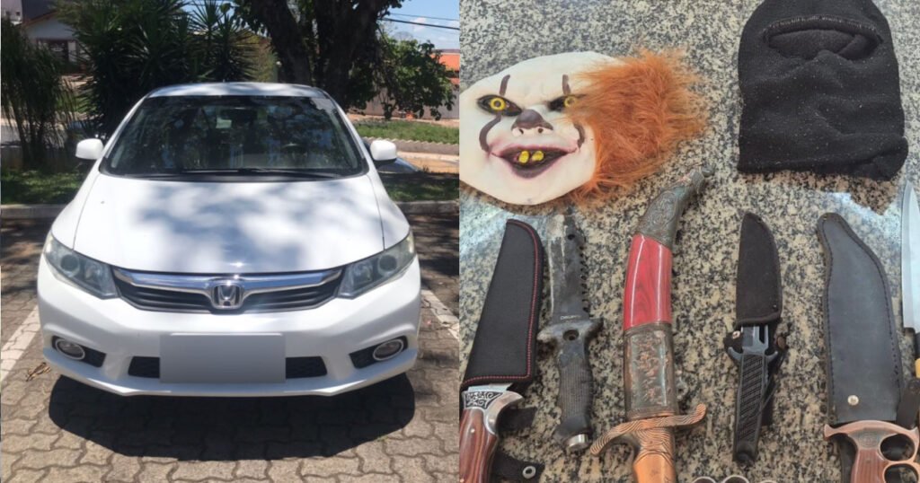 Com o apoio de várias viaturas, equipes da PM foram ao endereço citado e encontraram três suspeitos, além de objetos ligados a práticas criminosas: oito facas, uma balaclava, uma máscara de palhaço e um soco-inglês, todos apreendidos.