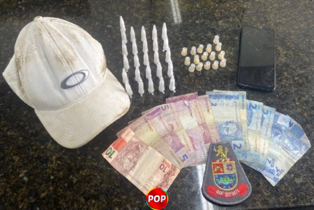 A equipe estava em patrulhamento quando avistou um indivíduo com um volume na blusa, foi realizada a abordagem e na busca pessoal foram localizados enppendorfs de substâncias assemelhadas a Cocaína (26), Crack (16) e R$ 52,00 (cinquenta e dois reais) em dinheiro.