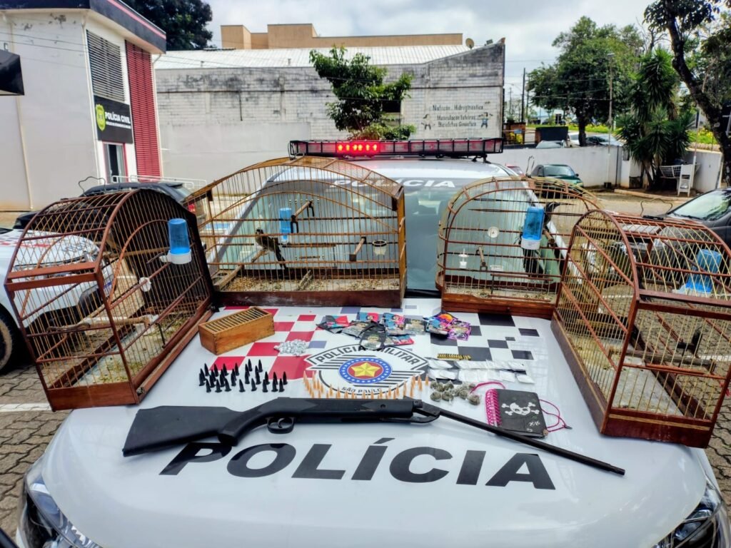 Ao realizar diligência na residência do abordado, a equipe localizou uma espingarda de pressão modificada para arma de fogo de calibre 22 e quatro pássaros silvestres sem registro.