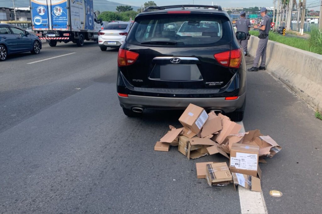 Durante a busca pessoal e vistoria do veículo, foram encontradas diversas caixas de produtos eletrônicos que, posteriormente, foram identificados como sendo produtos roubados.