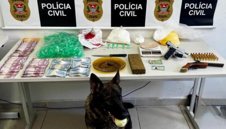 Os policiais foram até um imóvel localizado no bairro Caioçara; no quintal, havia duas residências. Em uma delas, foi localizado um casal, e dentro do imóvel, foram encontrados mais de R$ 10 mil em dinheiro, uma arma de fogo, munições, anotações e celulares.