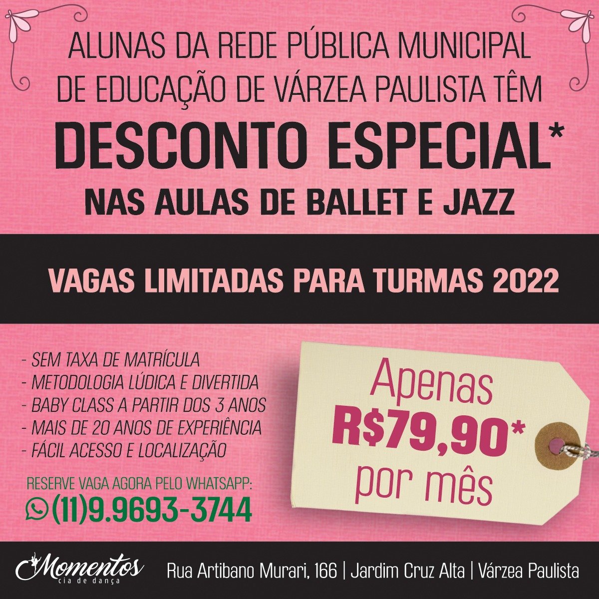 “Na verdade a formação de uma bailarina profissional exige um pouco mais de investimento e tempo, mas a prática regular não é caro. Temos muitas boas escolas na região que têm preços acessíveis. Na Momentos, alunos da rede municipal de educação de Várzea Paulista pagam apenas R$79,90 ao mês. Pouco investimento para o retorno que o ballet traz.” Disse Janaina Pereira.