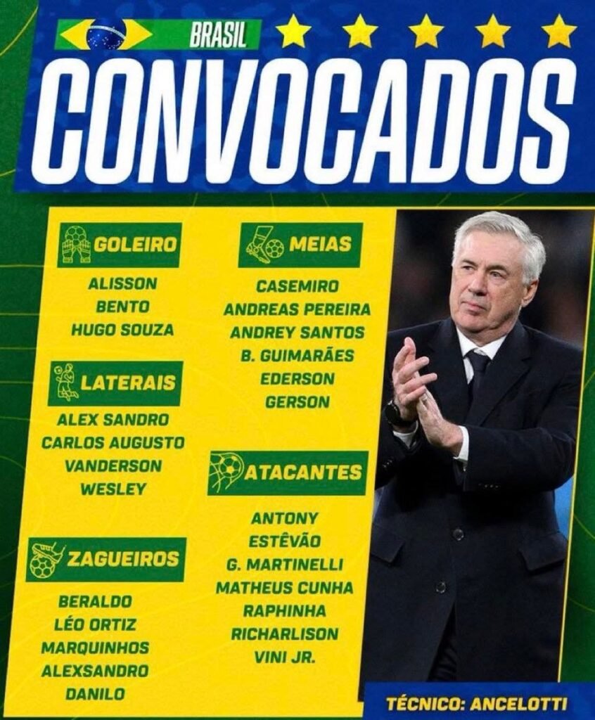 O novo técnico da Seleção Brasileira, Carlo Ancelotti, anunciou, nesta segunda-feira (26), sua primeira lista de convocados para os próximos compromissos nas Eliminatórias Sul-Americanas para a Copa do Mundo. Ao todo, 25 jogadores foram chamados para os confrontos contra Equador e Paraguai.