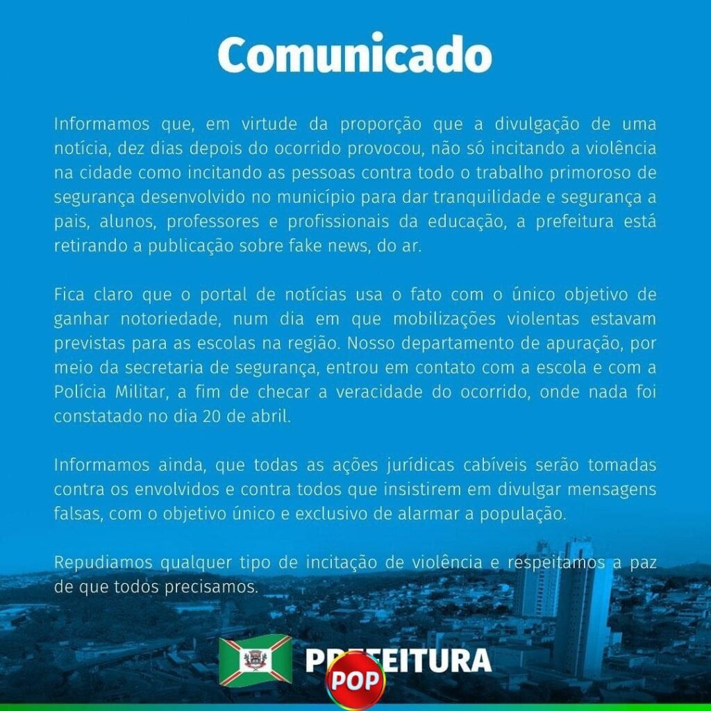 Após a divulgação da veracidade dos fatos, a prefeitura de Campo Limpo Paulista apagou a publicação que acusava os portais de compartilharem “fakenews”.