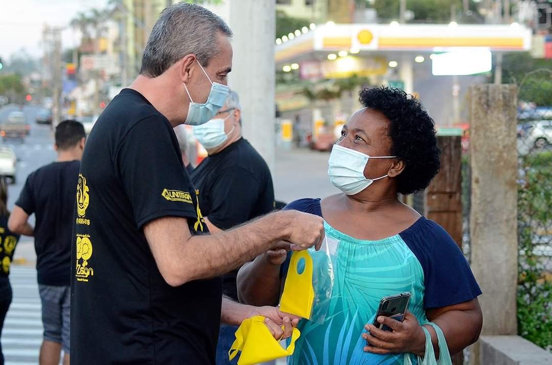 Com a presença do prefeito Rodolfo Braga e outras autoridades, a equipe do órgão municipal distribuiu cerca de 200 máscaras para condutores no cruzamento entre as Avenidas Fernão Dias Paes e Bertioga, quando o semáforo fechava.