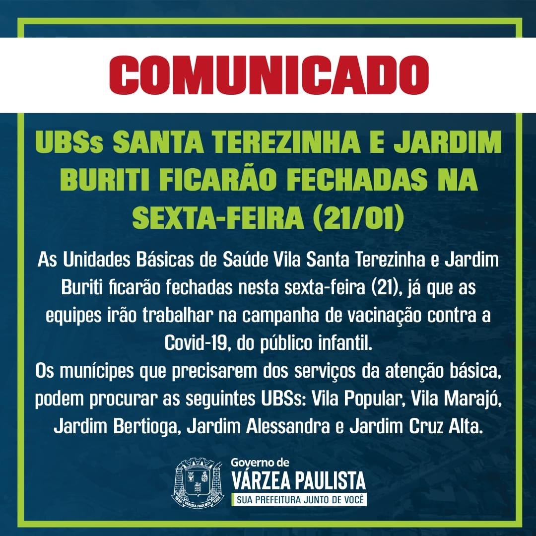 SaúdeVárzea Paulista Prefeitura de Várzea Paulista irá fechar duas UBS para reforçar a vacinação contra Covid por Redação em 19/01/2022 Nesta quarta-feira (19), através das suas redes sociais a Prefeitura de Várzea Paulista informou que irá fechar duas UBSs da cidade.