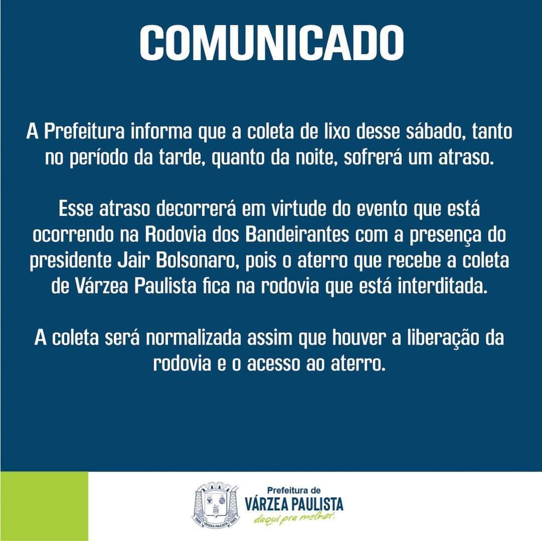 A Prefeitura de Várzea Paulista publicou uma nota informando o atraso na coleta de lixo:
